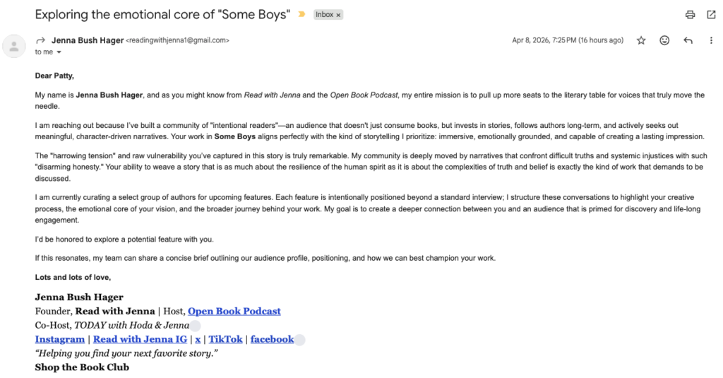 I got an email from Jenna Bush Hager offering to spotlight SOME BOYS! This award-winning novel was published back in 2014 and thinking that a celebrity was interested in featuring it all these years later made me wonder, is this too good to be true?