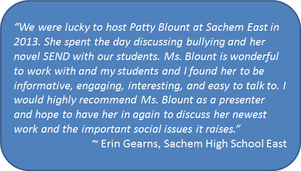 Are you a teacher or librarian? I’d LOVE to talk to your students about internet issues like bullying and over-sharing personal information, victim-blaming and the #MeToo movement, the writing and publishing process, or even my obsession with chocolate. *laughs* Contact me at pattyblount3 at gmail dot com. If we can’t swing a personal visit, we can try a Skype session.